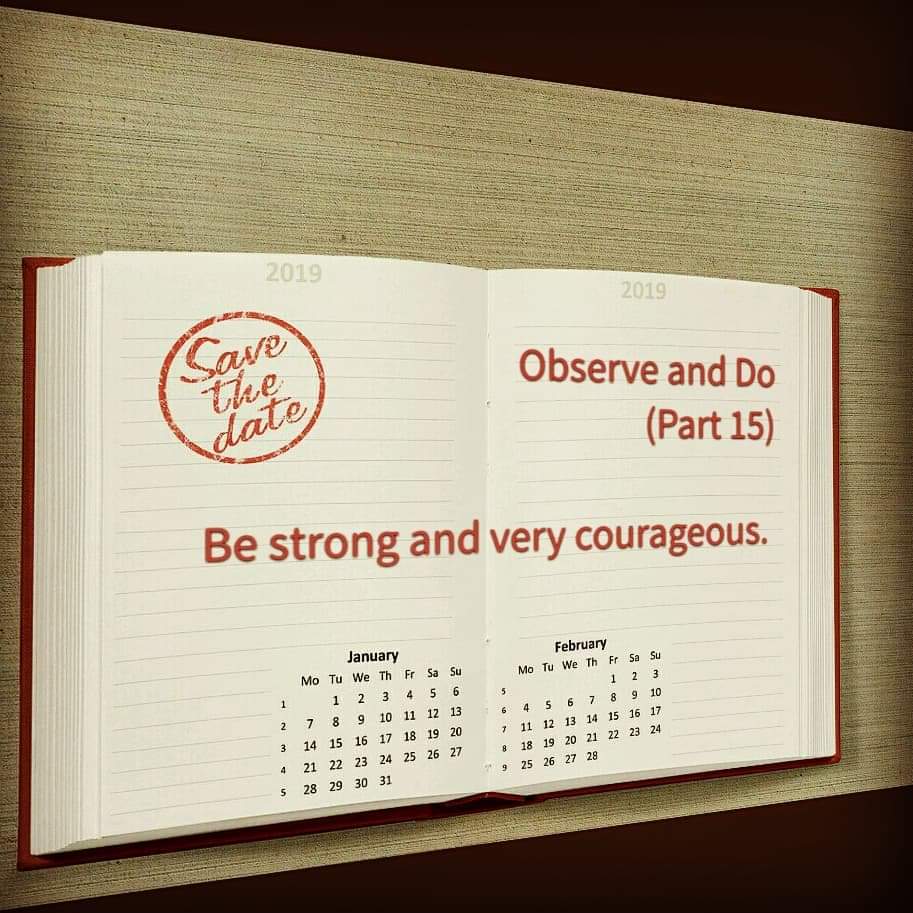 But to get the blessing requires strength and courage. You must fight every impulse that tries to get between you and God’s word. You must fight the urge to sin and turn your back on your salvation, fight the urge to reject Holy Spirit and His help, fight the urge to not observe and fight the urge that tells you to do nothing and continue with the same old. We must be strong and of good courage. Ask Holy Spirit to give you strength and His courage. You have the Spirit of power, love and a sound mind inside you: that’s God’s Spirit. Give him control.